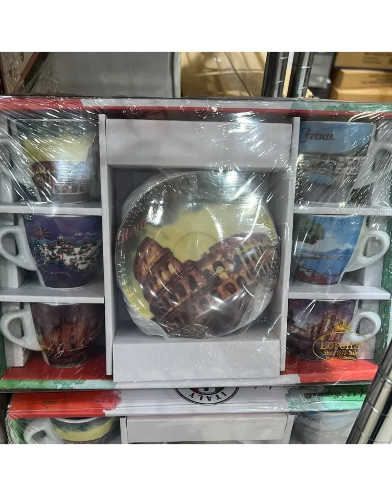 This Italian-style espresso set makes a great gift for coffee lovers or people who like fancy home decor! These strong cups are made to bring out the best aromas in every sip of perfectly brewed coffee. Hand washing is the best way to keep the bright cityscapes looking good for a long time. Good coffee!